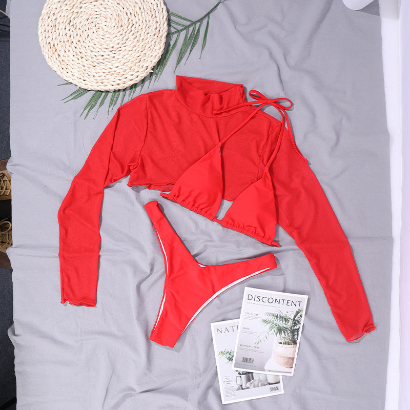 Bikini Solid Color Three-Piece Sexy Backless High Elastic Swimsuit Women Halter Lace-up Bikini