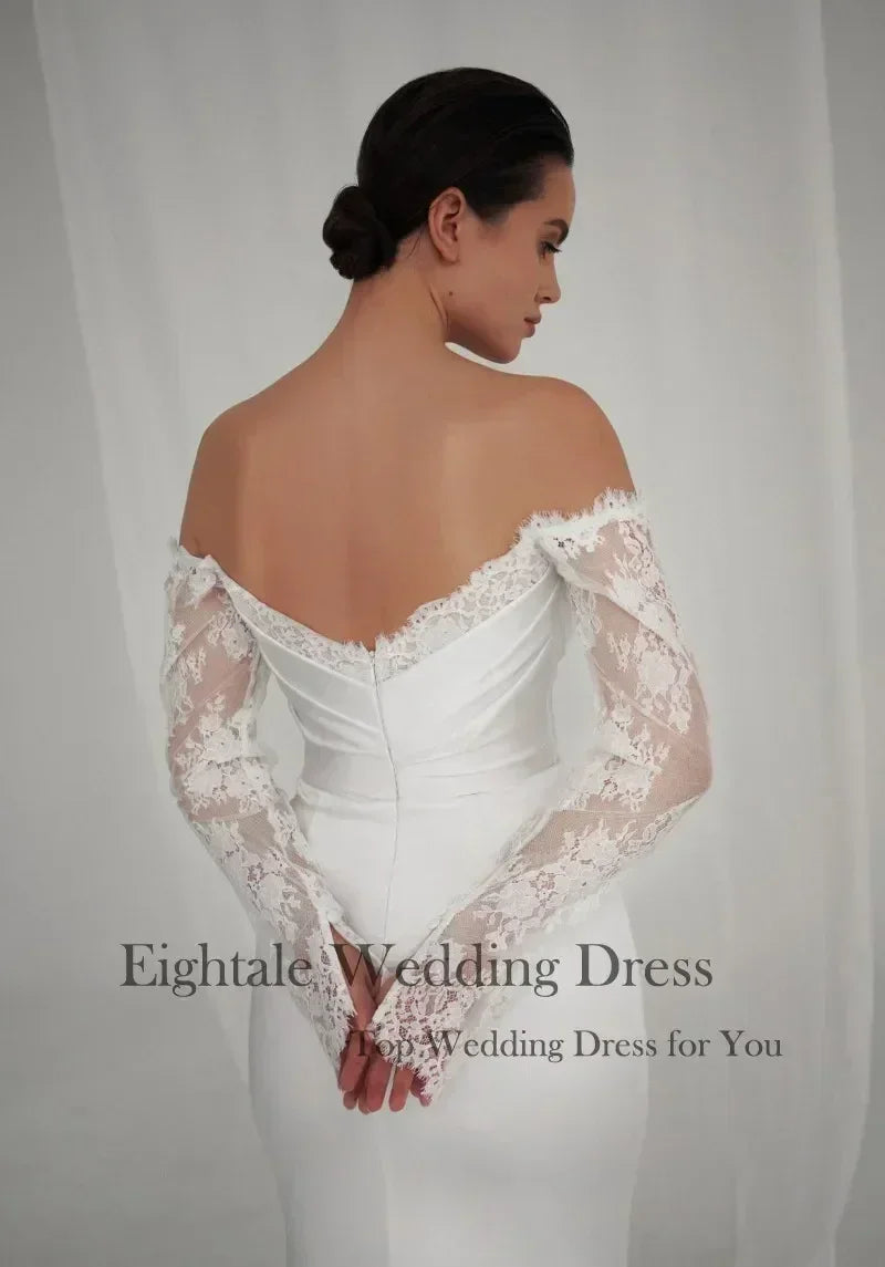 The Eightale Bohemian Mermaid Wedding Dress combines free-spirited charm with sophisticated silhouette. This custom-made gown features a flattering off-shoulder sweetheart neckline, intricate lace detailing, and a dramatic mermaid silhouette that flows into a elegant sweep train. Perfect for the bohemian bride seeking both vintage inspiration and modern elegance.
