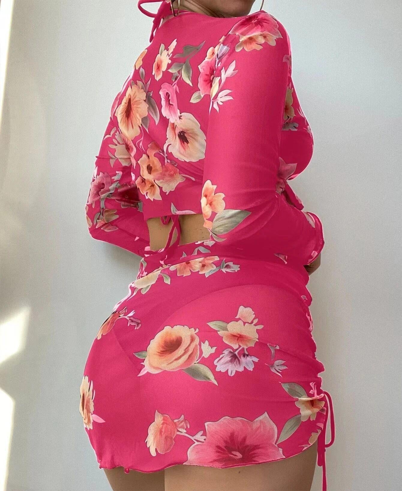 Four Piece Swimsuit Sexy Split Printed Mesh Long Sleeve Swimsuit High Profile Figure