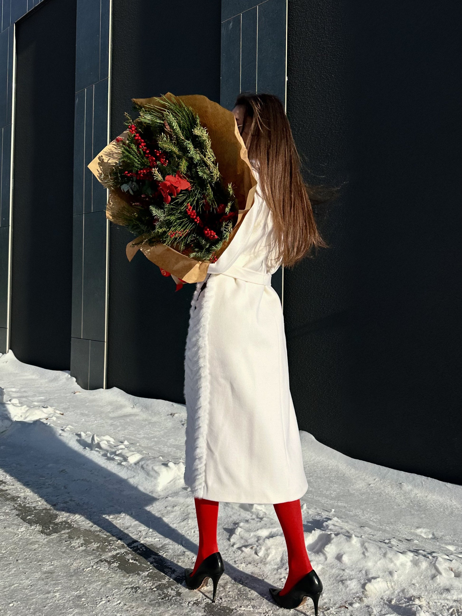 Genuine Mink Fur Rex Fur Trim Virgin Wool Coat in White