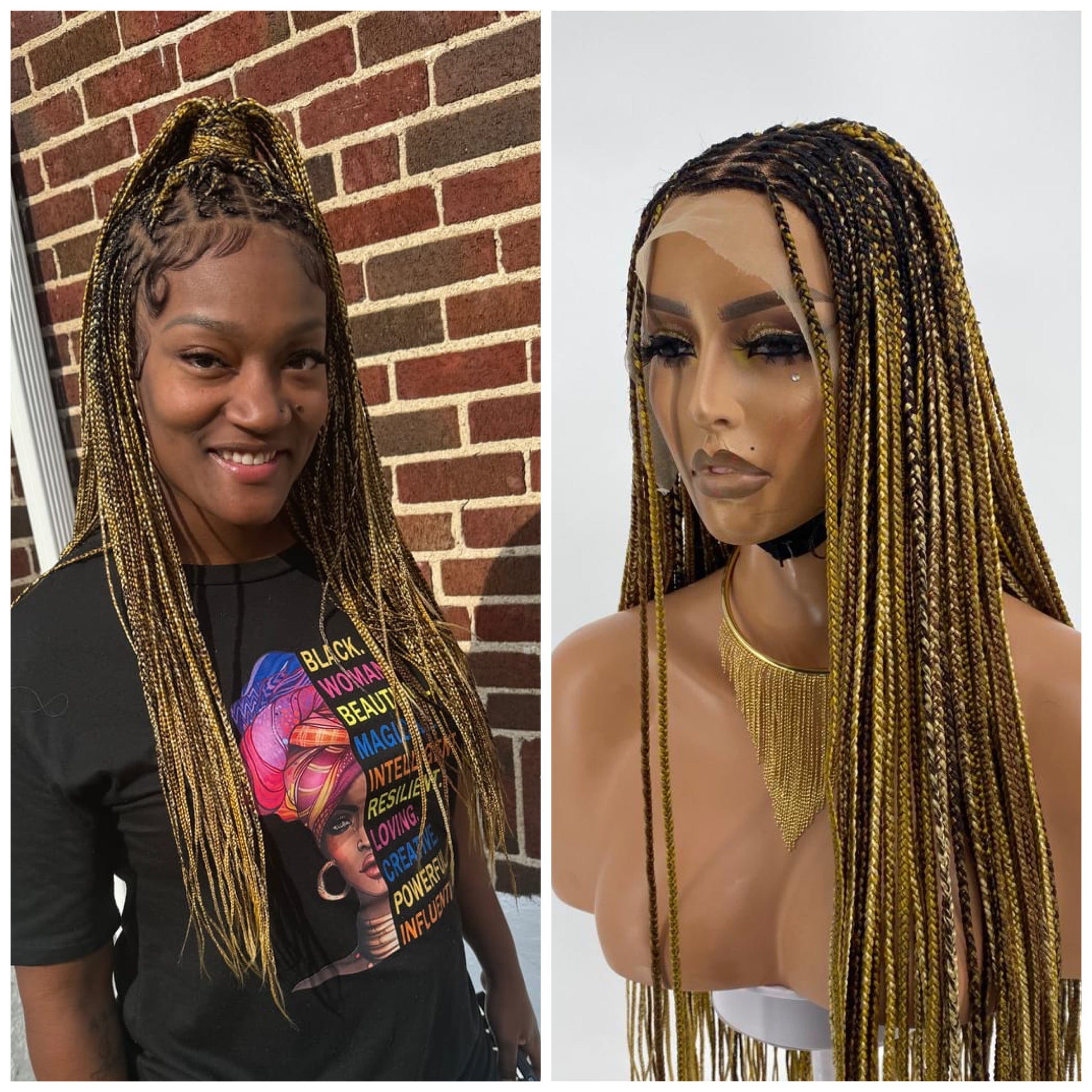 This unit is a custom hand-tied knotless braids wig with a selective custom option.