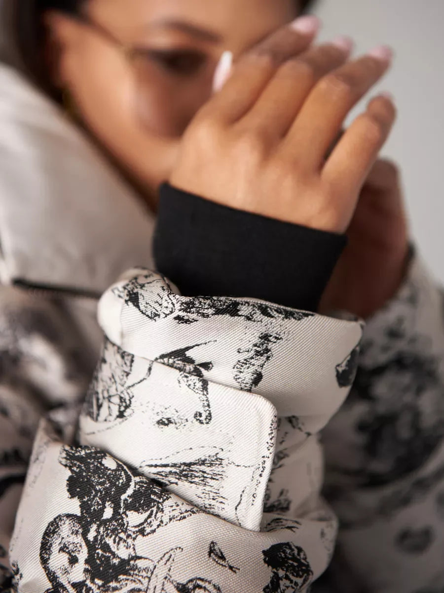 Introducing a luxurious jacquard down coat that effortlessly blends high fashion with warmth. This standout piece is made from premium-quality jacquard fabric featuring an intricate black-and-creme print, evoking timeless elegance and sophistication. Filled with high-quality down, this coat offers exceptional insulation for chilly weather without compromising on style. Details like a cinched belt add definition, while the high collar and practical pockets ensure both comfort and functionality. Perfect for making a statement while staying warm, this coat is a testament to refined craftsmanship and contemporary outerwear design.