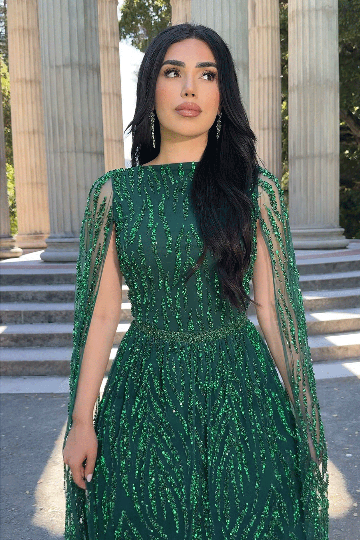 The Nilah Modest A-Line Embellished Cape Sleeve Dress is a stunning modest long sleeve evening gown. This breathtaking creation that exudes elegance and modesty, ideal for special occasions like the Nikah ceremony. This evening gown is meticulously crafted from thousands of hand-sewn sequins in a stunning Nikah Emerald Green, ensuring every wearer shines with sophistication. The dress features long drape cape sleeves, a modest neckline, and a flowing A-line skirt, all designed to combine comfort with high-end fashion.