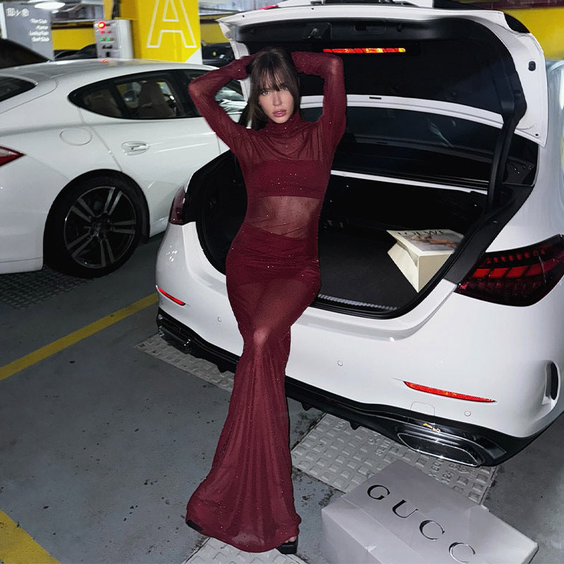 Sexy Half Turtleneck Slim Fit Mesh See through Drilling Dress Outerwear Cover up