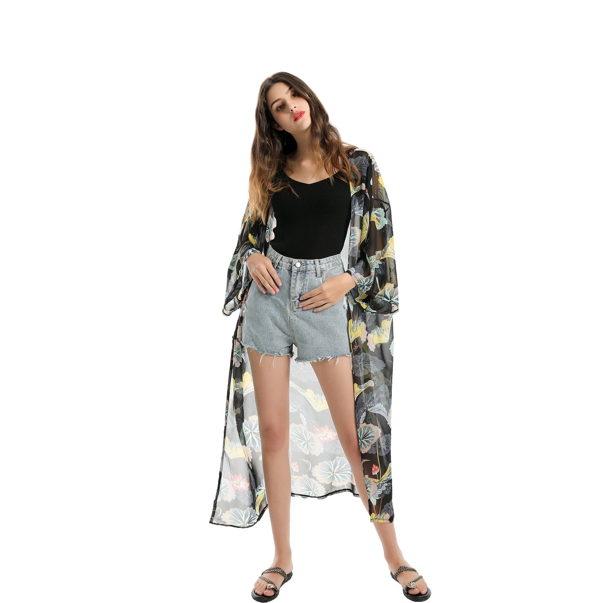 Spring, Summer, Autumn Classical Elegant Floral Lotus Leaf Travel Sun Protective Blouse Swimwear Cover up