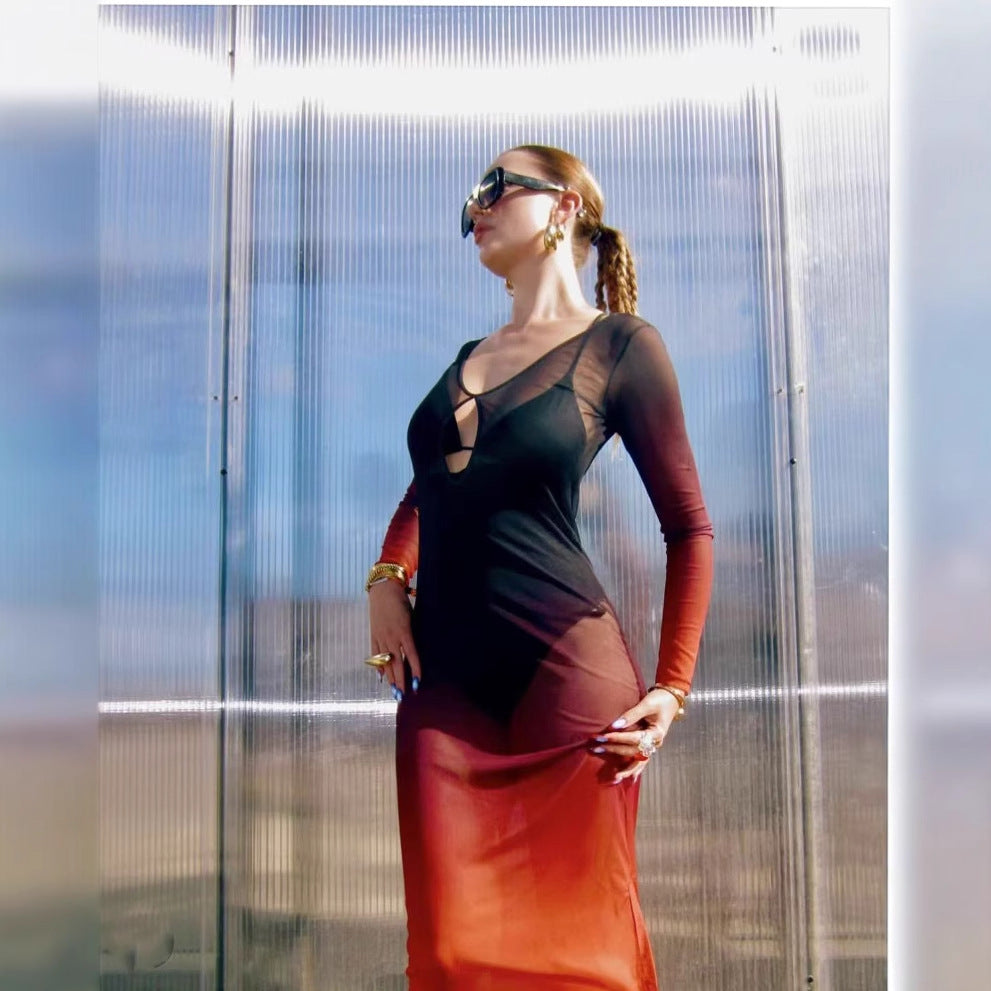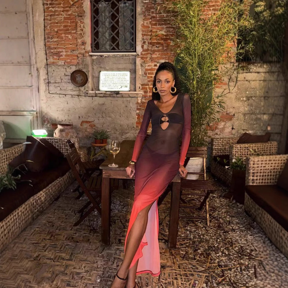 Spring Summer Color Contrast Gradient Transparent Hollow Out Cutout Split Vacation Beach Dress