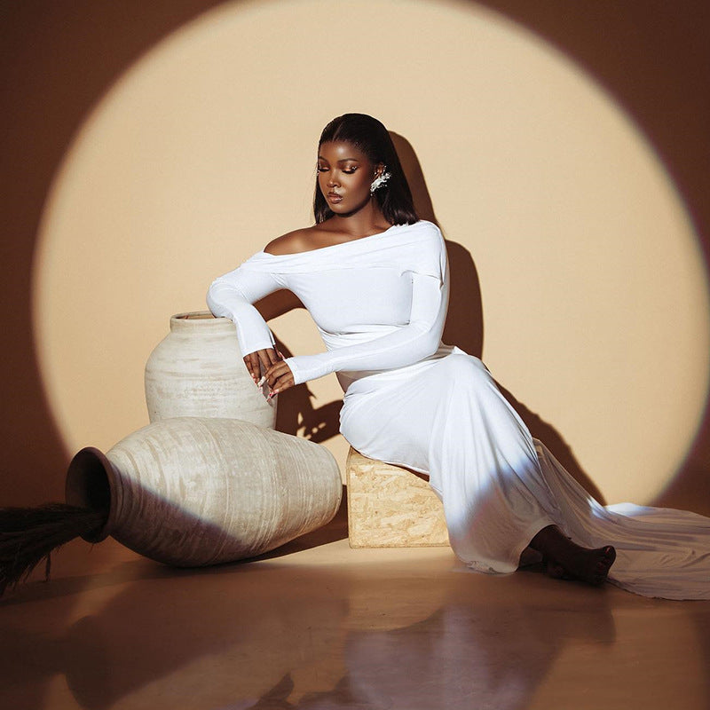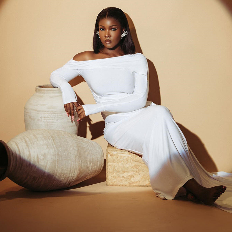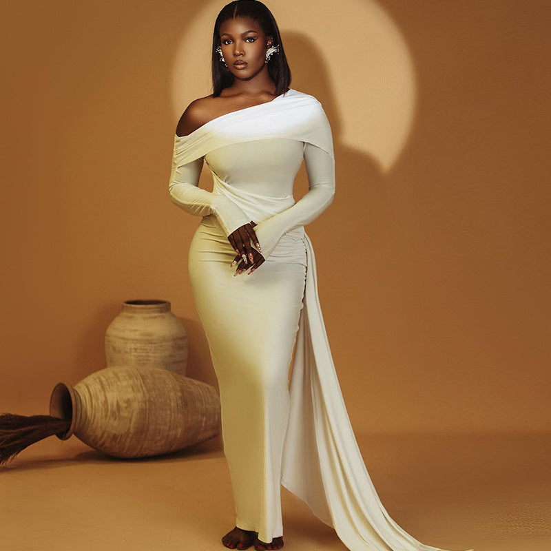 Women Clothing Solid Color Dress Diagonal Collar Open Shoulder Long Sleeve Irregular Asymmetric Dress