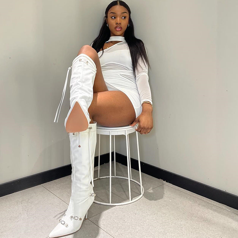 Women Solid Color Dress Sexy Hollow Out Cutout Dress Mesh Stitching Hip Dress